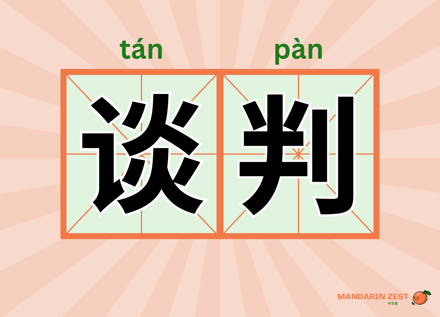 Today, we’re exploring 谈判 (tánpàn) — a cornerstone term in business Chinese meaning “to negotiate” or “to hold talks.” Whether it’s a business deal, a salary discussion, or a trade agreement between countries, 谈判 is your go-to word whenever two sides are sitting down to reach an agreement.