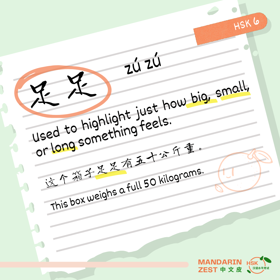 In English, we often want to highlight just how big, small, or long something feels. You've probably heard phrases like "he was a full 300 pounds" or "he was all of seven feet tall." In Chinese, there's a similar expression to add this kind of emphasis: 足足 (zúzú).