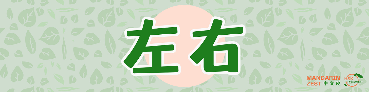 左右 (zuǒyòu) is a very versatile word with several uses, literally meaning “left right”. It is most often used to make an approximation: “around / about / roughly”. It can also be used literally, or in figurative expressions like “both sides.”