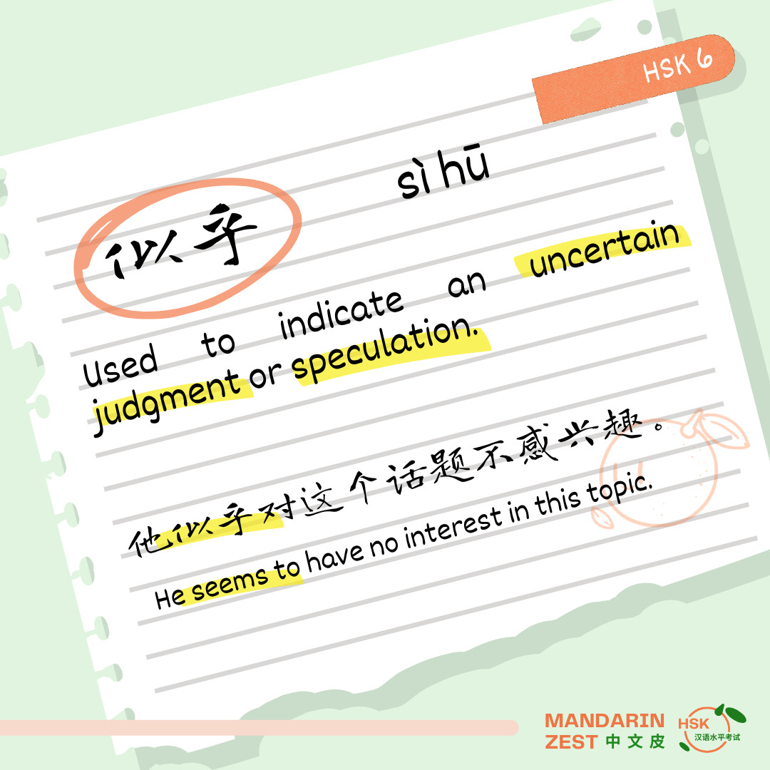 The adverb 似乎 (sì hū) is used to indicate an uncertain judgment or speculation, similar in meaning to 好像. However, 似乎 is more formal and often appears in written language.