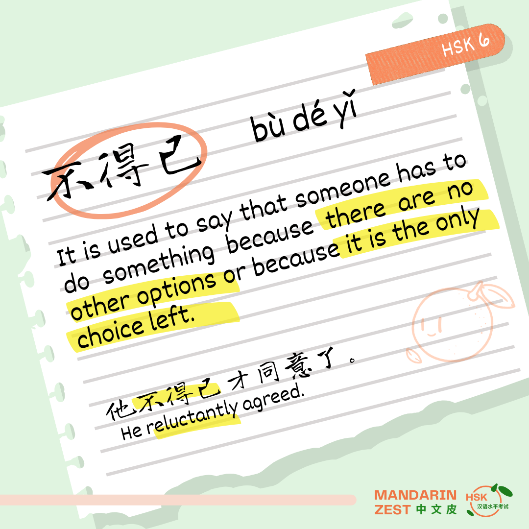 不得已 (bù dé yǐ) is an expression used to say that someone has to do something because there are no other options or because it is the only choice left. It appears after the verb:
