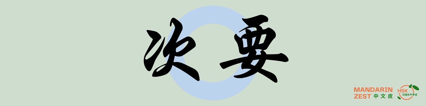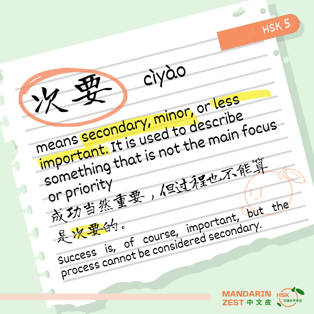 次要 (cìyào) is a Chinese adjective that means secondary, minor, or less important. It is used to describe something that is not the main focus or priority.