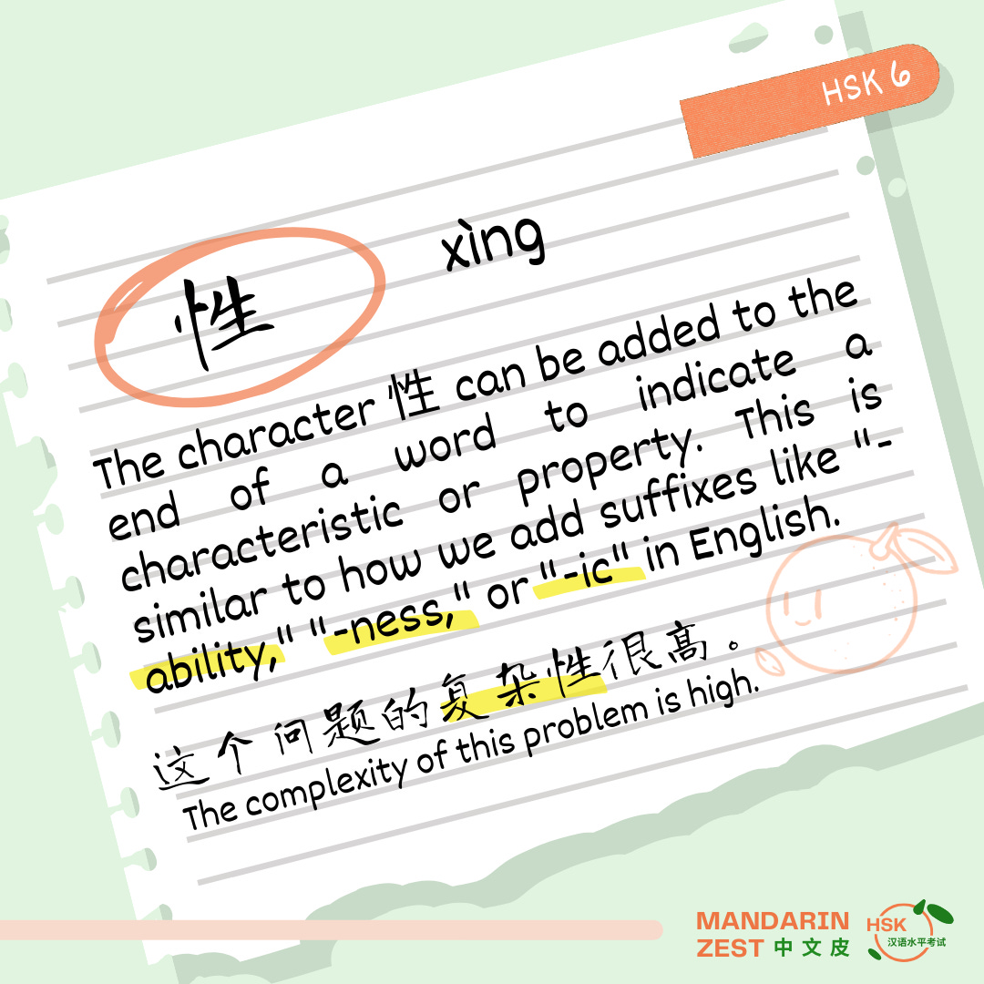In Chinese, the character 性 (xìng) can be added to the end of a word to indicate a characteristic or property. This is similar to how we add suffixes like "-ability," "-ness," or "-ic" in English. For example: