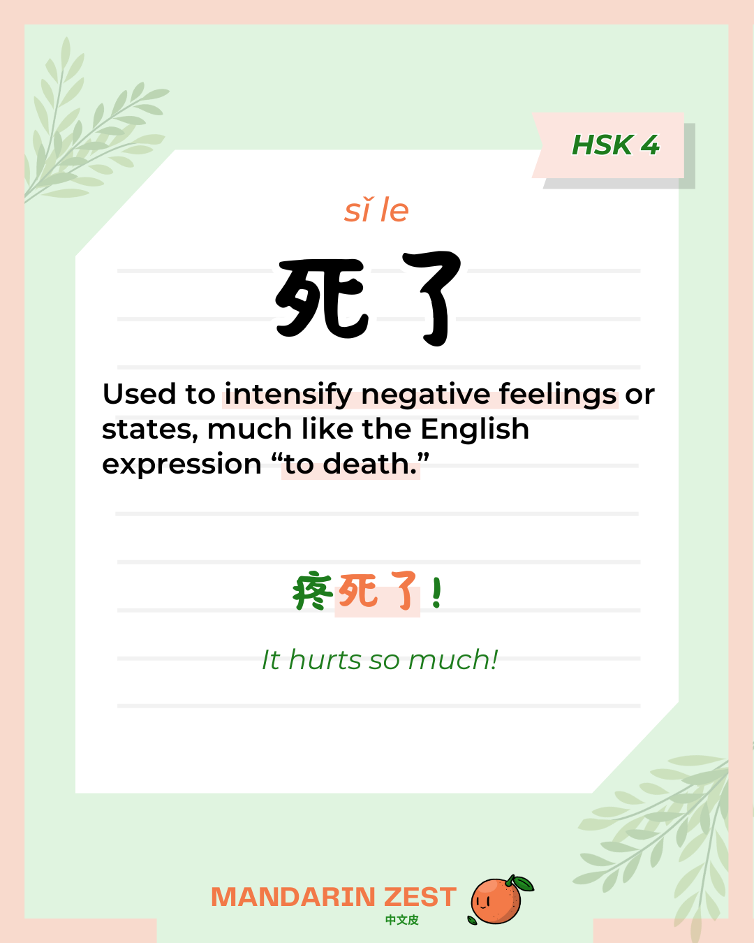 The expression 死了 (sǐ le) in Chinese is used to intensify negative feelings or states, much like the English expression “to death.” It’s a colloquial and dramatic way to express how extreme something feels.