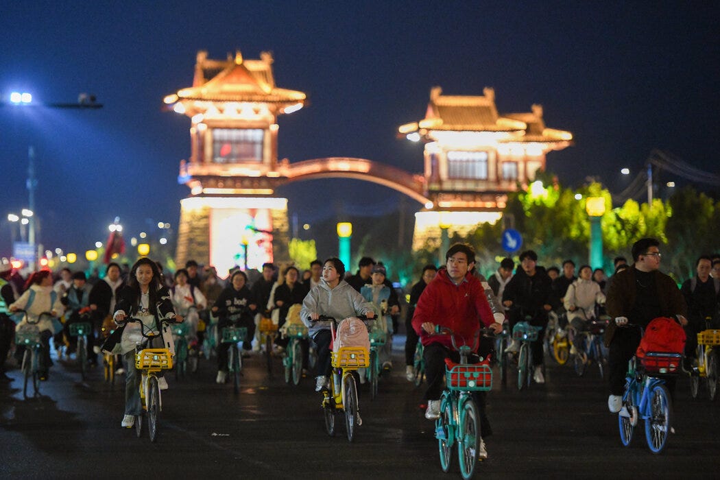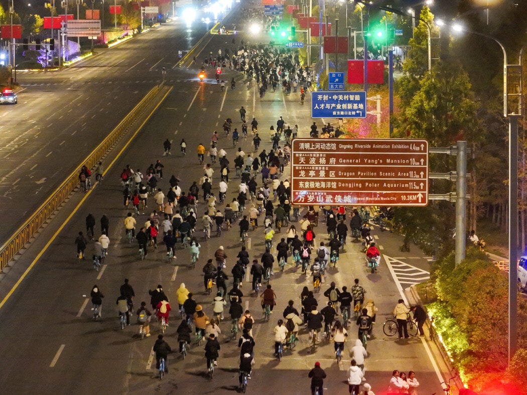 In Zhengzhou, Henan, thousands of young people began cycling at night to the nearby town of Kaifeng. As the activity went viral, even more people joined in, giving rise to the trend known as "Night Ride to Kaifeng" (夜骑开封).