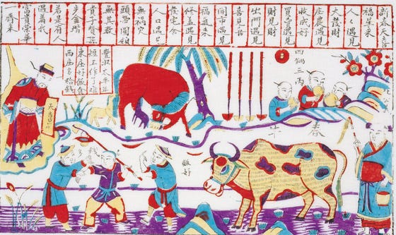 He also noted that the cooperation between humans and oxen was symbolically represented in the "Spring Ox Picture" (Chunniutu), which in ancient agricultural society was used to predict the weather and the 24 solar terms of the year.