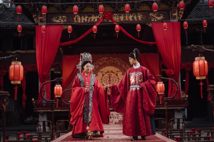 At traditional Chinese weddings, both the bride and groom wear red wedding attire. The venue is decorated with red lanterns, red flowers, and red ribbons to symbolize joy and a blessed union.