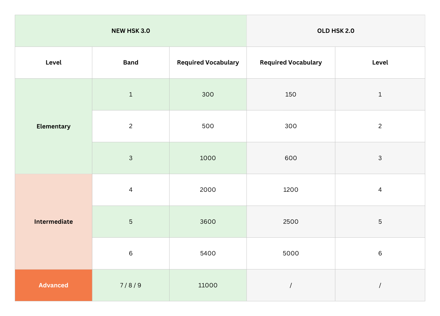Here is how the new system compares to HSK 2.0:
